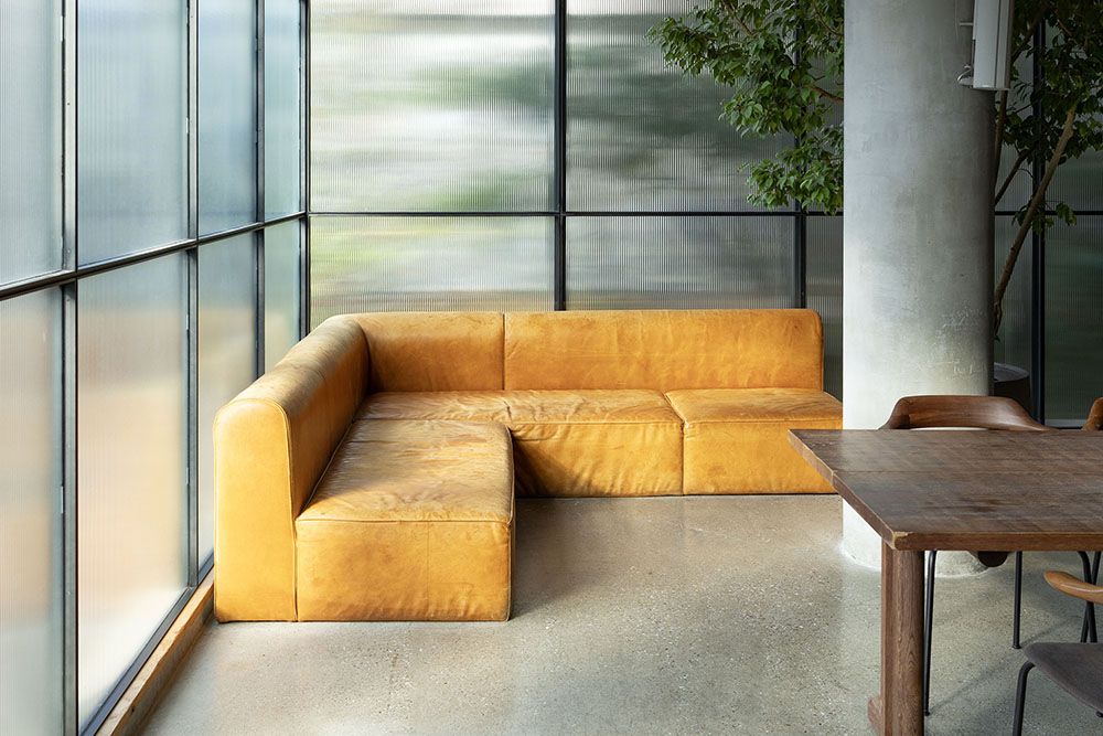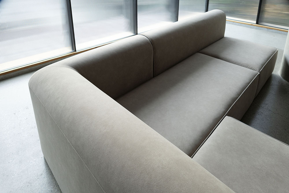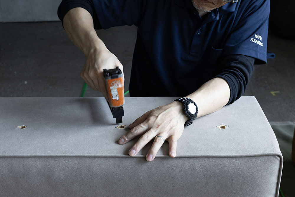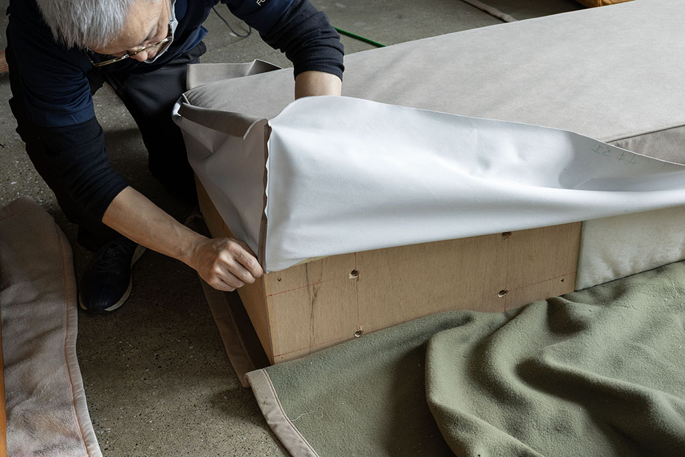 造作ソファの張替えを、現地にて実施した事例です。明るい茶系の革張りソファは、長年の使用により経年変化や使用感が目立つようになり、張替えのご要望をいただきました。ただし大型の造作ソファは搬出・移動が難しいため、現地での張替え作業をご提案し、定休日を利用して実施しています。本ソファは造作家具のため、サイズなどの詳細な情報がマルニ木工には残っていませんでした。そこでまず現地にて採寸を行い、そのデータをもとに工場で仮カバーを製作。さらに現地でフィッティングと微調整を行ったうえで、本番用カバーを製作しました。事前の採寸と現場合わせを丁寧に行ったことで、当日の作業は滞りなく進み、想定時間内に完了しています。今回の張替えでは、式場という使用環境を踏まえ、日常のメンテナンス性を重視し、水拭きが可能な張地をご提案しました。