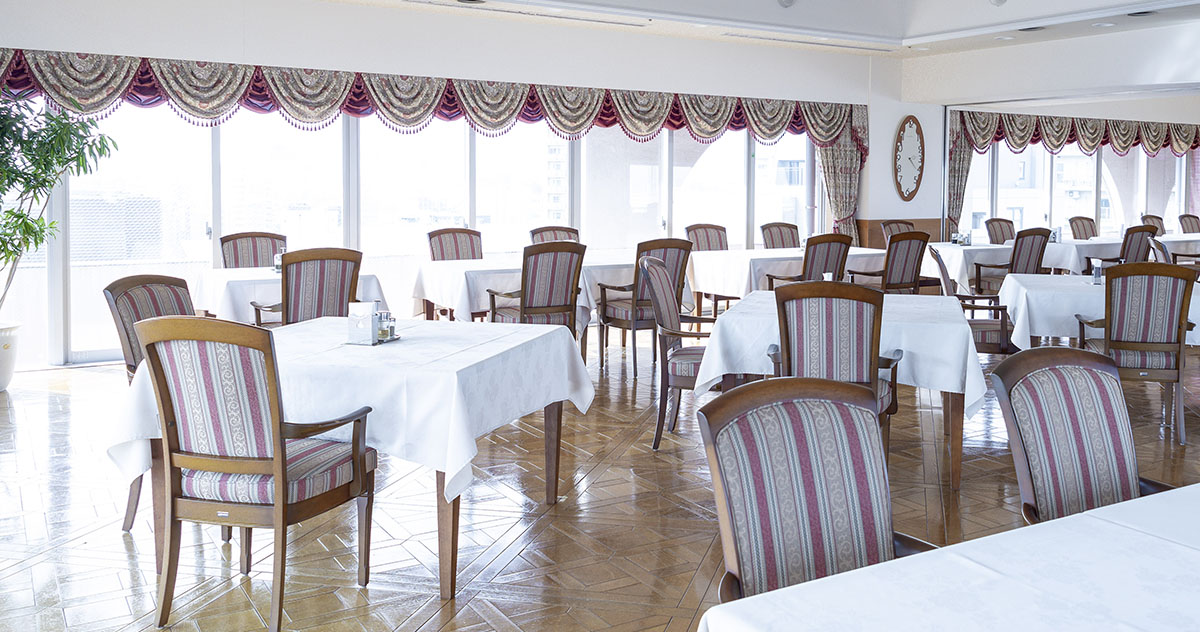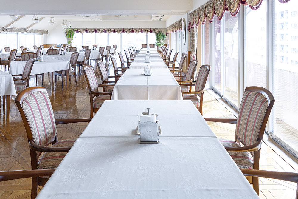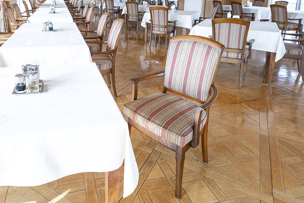 施設利用者が毎日食事をとるスカイダイニングでは、チェア約75脚の張替えを実施しました。本チェアは2014年にも張替えを行っており、日常的に使用される環境のため、家庭用家具と比較して早いサイクルでのメンテナンスが必要となります。そこで施設運営への影響を最小限に抑えるため、13脚ずつのローテーションによる分割対応を実施。利用状況に配慮しながら段階的に作業を進めました。また、既存の張地は利用者様からの評価も高かったことから、同一生地を継続して使用し、空間の印象を維持しています。