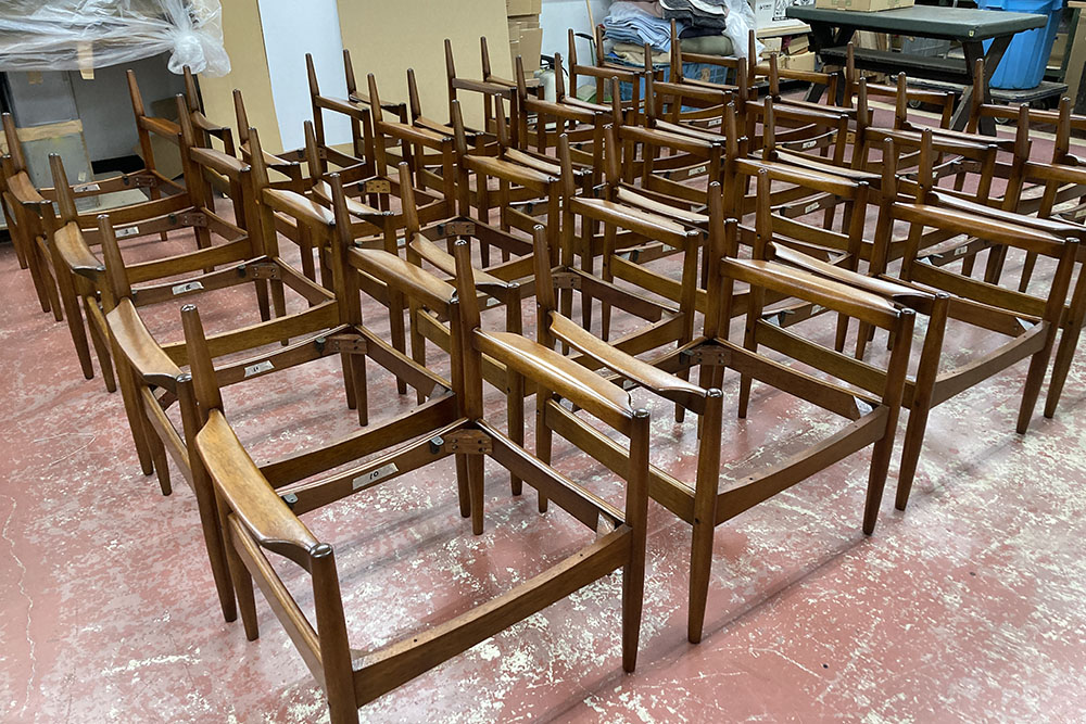 マルニ木工は修理専門の工場があります。ホテルやレストランなどの商業空間をはじめ、学校や図書館などの教育施設、オフィス、劇場などの家具のリフォームもお受けすることができます。ホテルやレストランなど、営業を止めたくないというお客様のご要望に合わせ、10脚ごとなどローテーションでの修理も可能です。 移動が難しい家具の場合には現場での修理、営業時間後の深夜作業などもご相談ください。