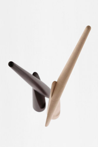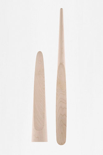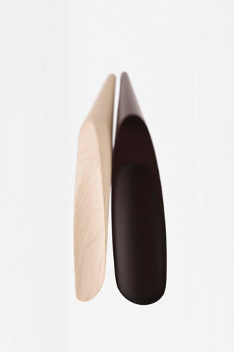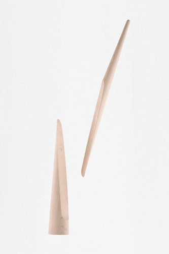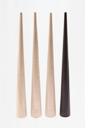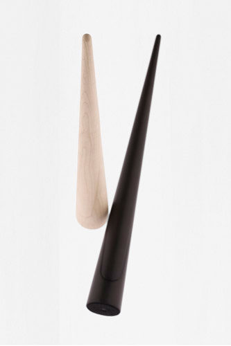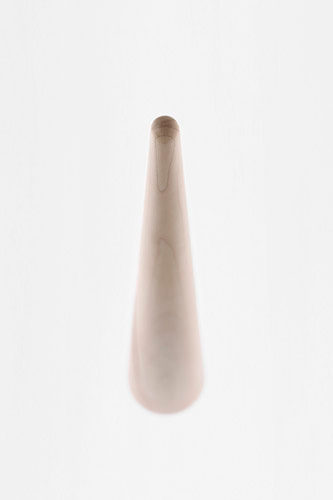 円錐の上部を持ち上げると、すぱっと斜めに割れて現れるくつべら。動物の角(=horn)を削ってくつべらにしていたことが「shoe horn(=くつべら)」の語源ですが、同一の木材を削り出すことで、仕込まれたネオジウム磁石によって固定された「台座」と「くつべら」の継目部分の木目も限りなく揃い、まるで一本の角のようになりました。片手で手軽に取り外せるように台座には安定するためのスチール製の重しが内蔵されています。