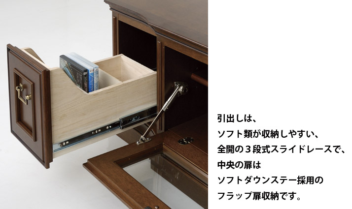 | 商品説明 | ●引出しはソフト類が収納しやすい、全開の3段式スライドレースで、中央の扉はソフトダウンステー採用のフラップ扉収納です。 ●ブレーカー付4口コンセント付。 |
