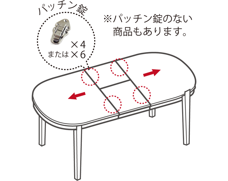 3.両側の天板を中央に押して天板を縮め、天板の裏側にあるパッチン錠(2または3箇所)で天板を固定してください。 ※パッチン錠のない商品もあります。 |