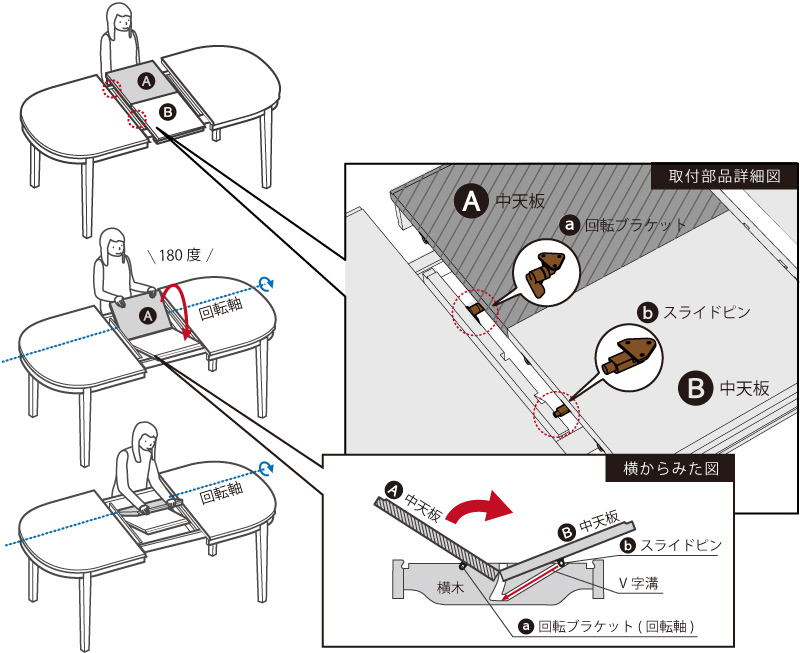 伸張式テーブルの天板を縮める方法
