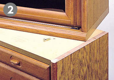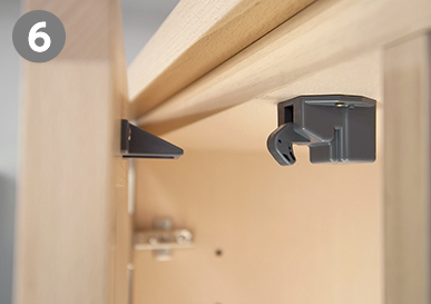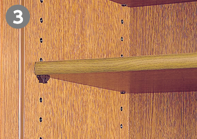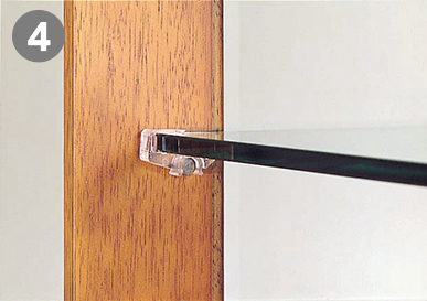 グラフィックスガラス棚(8mm厚)には専用棚受けダボを使用し、前後にズレるのを防止します。 |