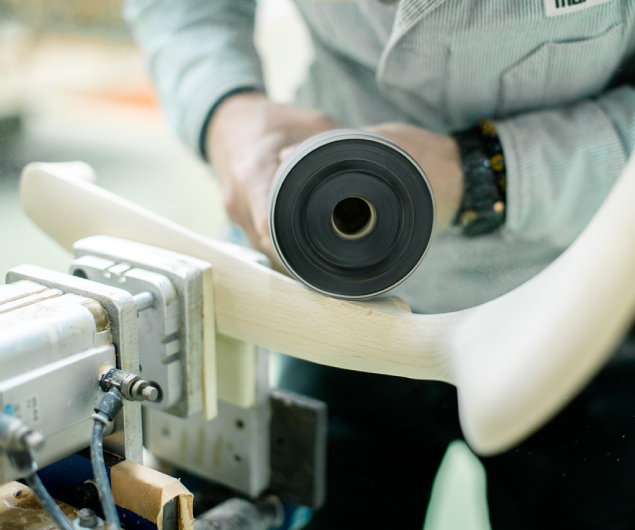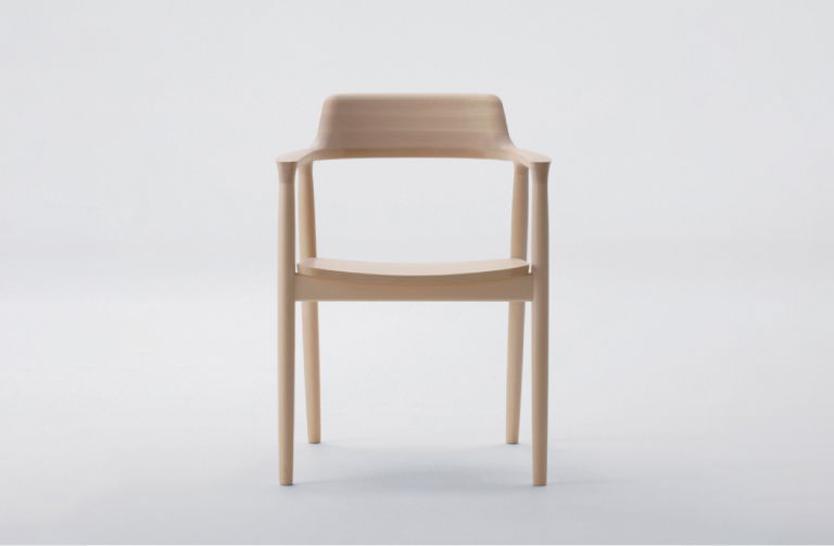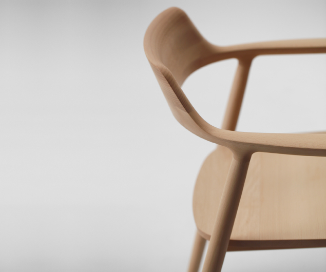 無垢材を立体的に削り出し、木の個性を見極めて20点以上のパーツを緻密に組み上げた“HIROSHIMA”アームチェアは、