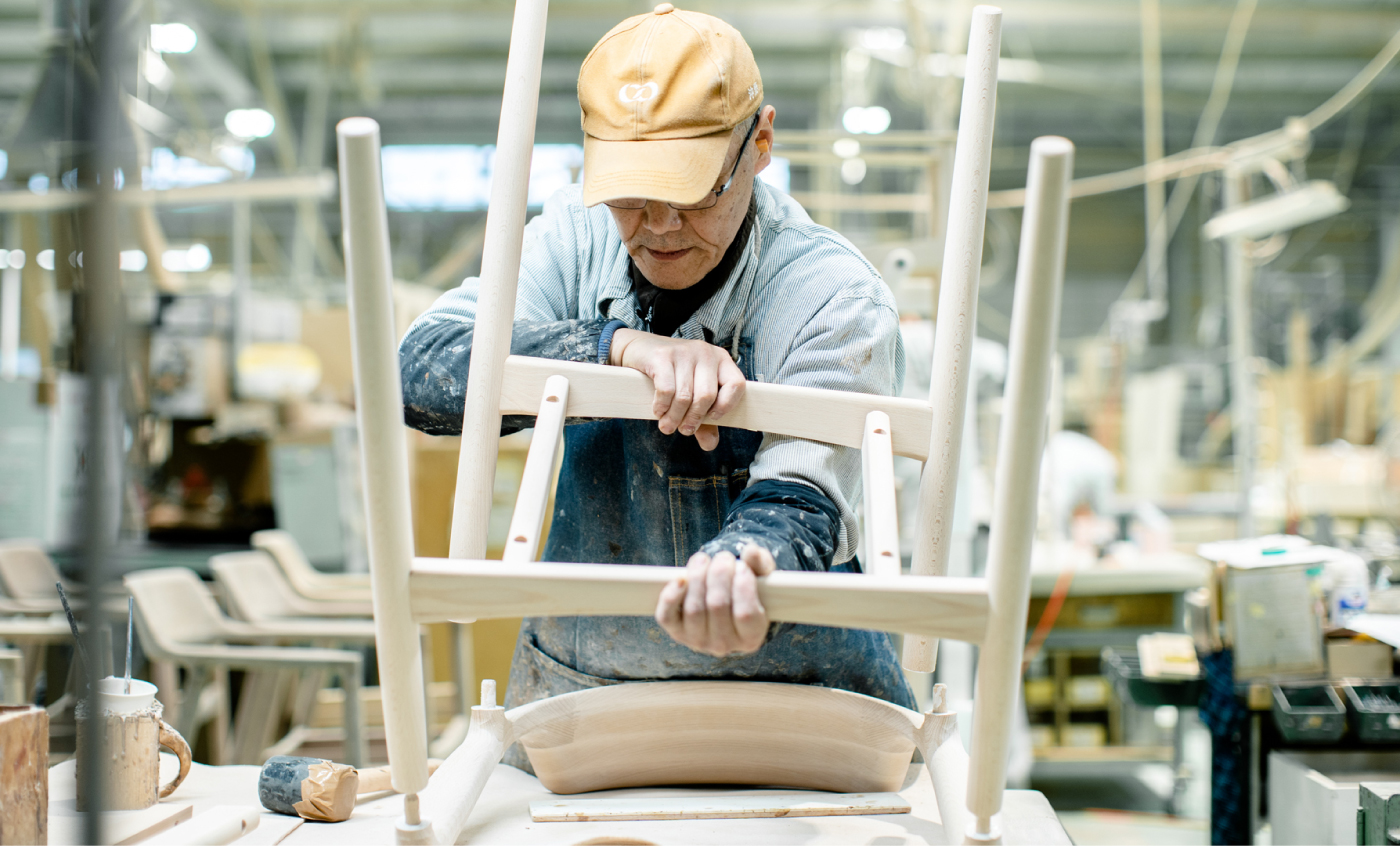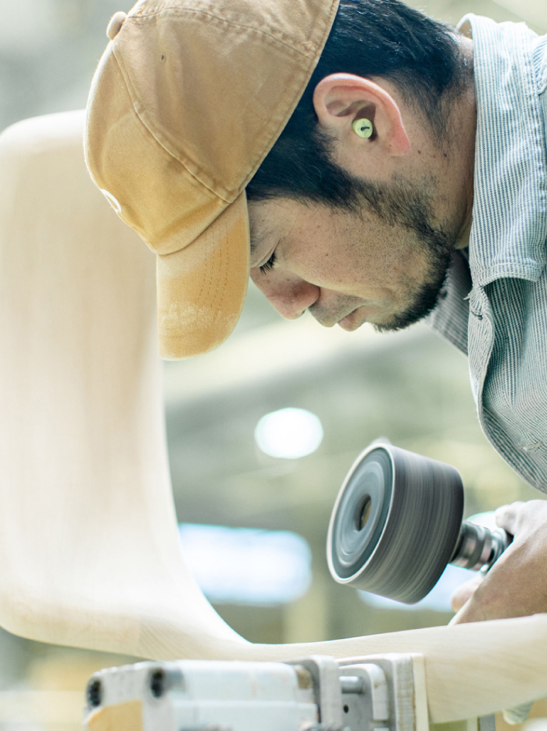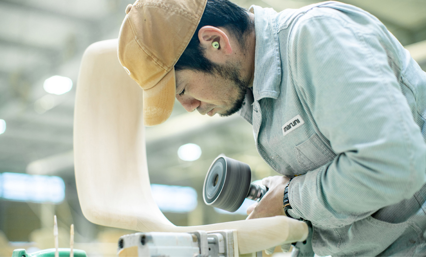 とりわけHIROSHIMAのような「丸み」を活かした椅子では、加工の自由度と職人の感性の融合が不可欠です。すべての工程において、徹底したこだわりと高精度な技術が注がれているのです。機械加工では出せない微細な曲面や、手に持ったときの「軽やかな重み」など、設計図には現れない情報こそが、座り心地や使い心地を左右します。木の繊維の向きに沿って磨いていく繊細な感覚。絶妙なバランスで取り去るエッジ。熟練の職人たちは、まるで木と会話をするように、その声を聞きながら仕上げていくのです。