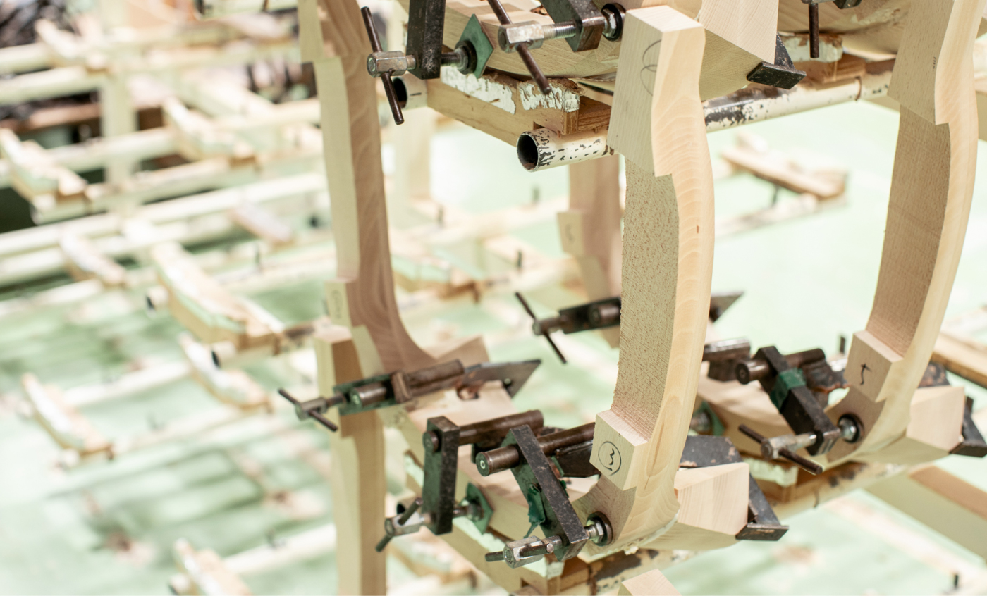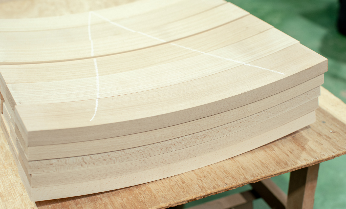 HIROSHIMAアームチェアの完成度を支えているのは、マルニ木工が100年かけて培ってきた「技術の結集」です。例えば世界中から集まる木材の選定は、目利きによってあらかじめ含水率を均一に整え、節や割れを取り除いた木材だけを選び、後々の動きや狂いを最小限に抑えています。さらに椅子の構造や造形にあわせて木目の流れや色味の調和を読み取ります。