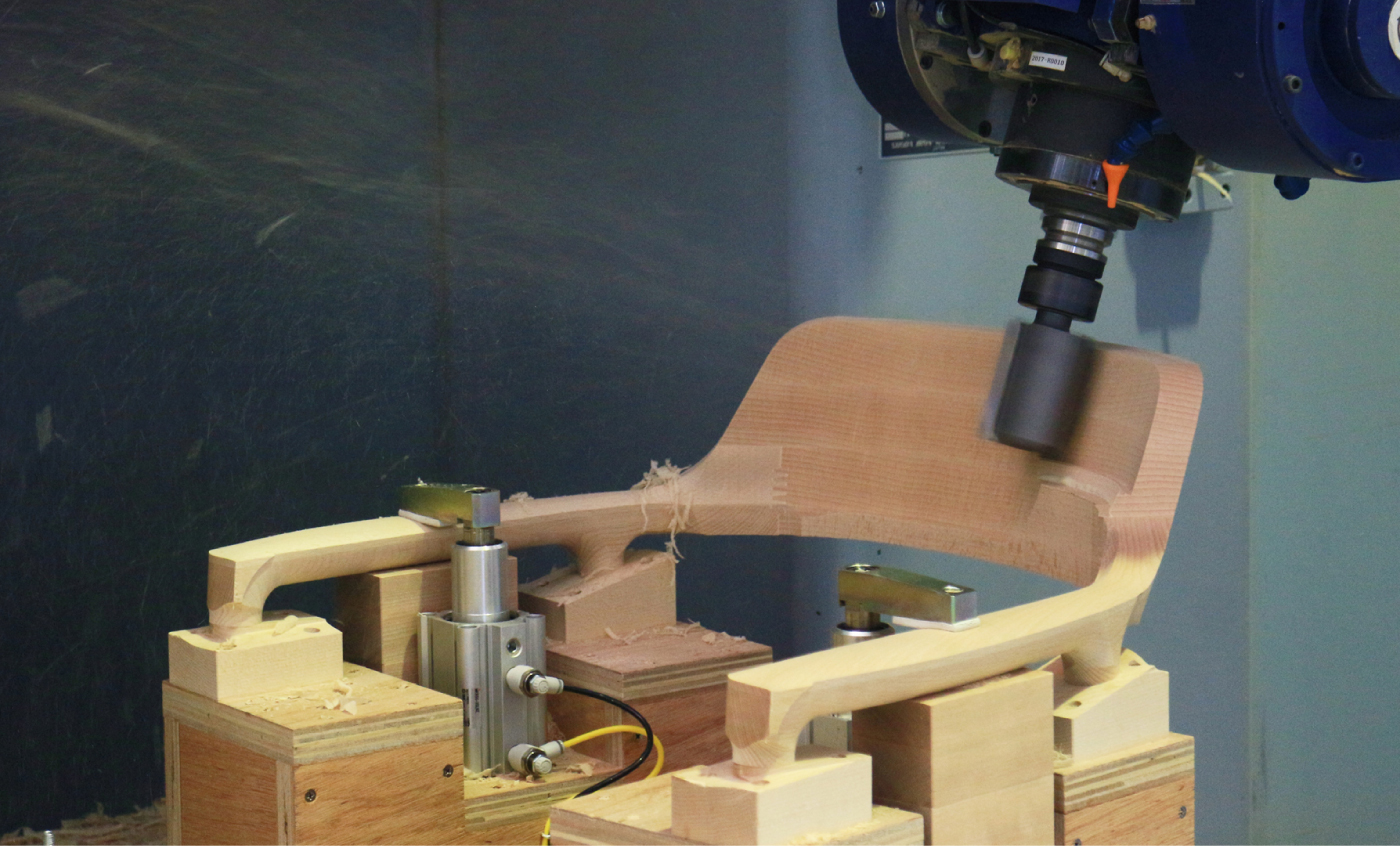 背からアームへの流れるような一体成形には、「CNC加工機(数値制御加工)」が欠かせません。この技術は、あらかじめ3Dで設計された曲線や面の形状を、0.1mm単位の精度で刃物に置き換えて制御し、無垢材を彫刻のように削り出します。木は、一本一本で硬さも繊維の流れも微妙に異なる個体差のある素材のため、刃物の回転数、送り速度、加工順序といったプログラミングは、まさに「削る木」と「つくるかたち」に合わせて、一脚ごとに最適化させる必要があります。デザインの美しさを損なわないために、複雑な3次曲面や滑らかな面取りが必要な箇所では、既製の機械では対応できないため、専用の治具(じぐ)や特殊刃物を独自設計し、センサー制御の微調整まで突き詰めることもあります。