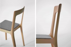 角材を組立てて作った椅子というよりも、一本の丸太を削り込んでできたような無垢な感じの小椅子を作りました。人の背中の曲線に沿うような椅子の背の丸みがHIROSHIMAのアームチェアのイメージと重なります。
