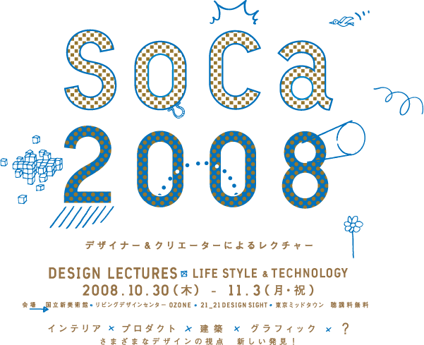 ─“SoCa(そっか)2008”は、国内外で活躍するデザイナー・クリエイターによるレクチャーイベントです。“Life Style&Technology”のテーマの下、デザイナーや各国のさまざまな分野の“ものづくり”に携わるプロフェッショナルが多角的な視点から各レクチャーを展開します。アート&デザインの新しい発信地ともいえる六本木エリアを中心に、21_21 DESIGN SIGHTを拠点として計4箇所で行うレクチャーは、建築・インテリア・プロダクト・ファッション・グラフィックなど各分野のデザイナーによるだけでなく、デザイナーと異業種プロフェッショナルとのコラボトークも数多く開催。多彩なレクチャラーから「生」の話を聞くことで、デザインへの新しい視点を得られることでしょう。(SoCa 2008サイトより抜粋)---