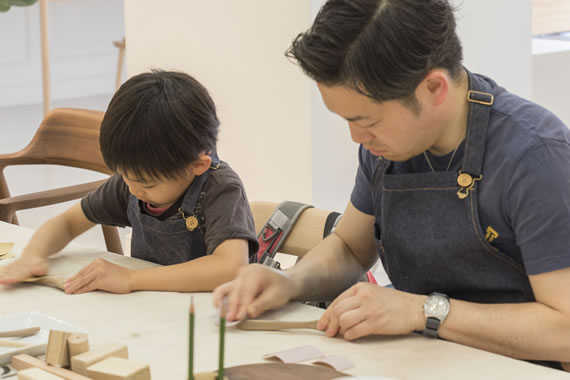 マルニ木工が家具を製作する際に出た端材を使ってカッティングボードを作製する、仕上げ工程を体験できる2日間限定ワークショップも開催します。あらかじめ粗く成型してある材料を紙やすりで滑らかにしていき、最後にオイルを塗って仕上げます。