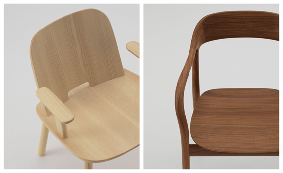 深澤直人氏のデザインによるTakoは、曲木を使わず切削加工だけで作り出されたオーガニックな曲線の椅子を発表いたします。彫刻的で柔らかなフォルムはマルニ木工の加工技術と「工芸の工業化」を目指す姿勢から生まれました。また、ジャスパー・モリソン氏のデザインによるFuguファミリーにはロビーチェアが仲間に加わります。マルニ木工が得意とする切削加工で表現された曲面は、座り心地のよい無垢の木製椅子に仕上がっています。