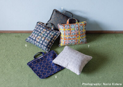| fig cushion お部屋のアクセントになるイチジクをモチーフにした ユ-モラスなかたちのクッション。 底辺Φ300 H300 mm 1:“minamo”דtambourine” forest mix \17,600(本体 \16,000) 2:“tambourine” navy×brown \16,500(本体 \15,000) 3:“tambourine” kahki×green \16,500(本体 \15,000) 4:“minamo”דtambourine” flower mix \17,600(本体 \16,000) | sampo cushion バッグ型のクッションカバーと中材のセットです。 カバーの方はバッグインバッグとしてもお使いいただけます。 バッグサイズ:約W380 330 mm クッション中材サイズ:約W370×H320 mm 5:“tambourine” kahki×green \17,600(本体 \16,000) 6:“minamo”דtambourine” forest mix \19,800(本体 \18,000) 7:“minamo”דtambourine” flower mix \19,800(本体 \18,000) 8:“tambourine” navy×brown \17,600(本体 \16,000) |